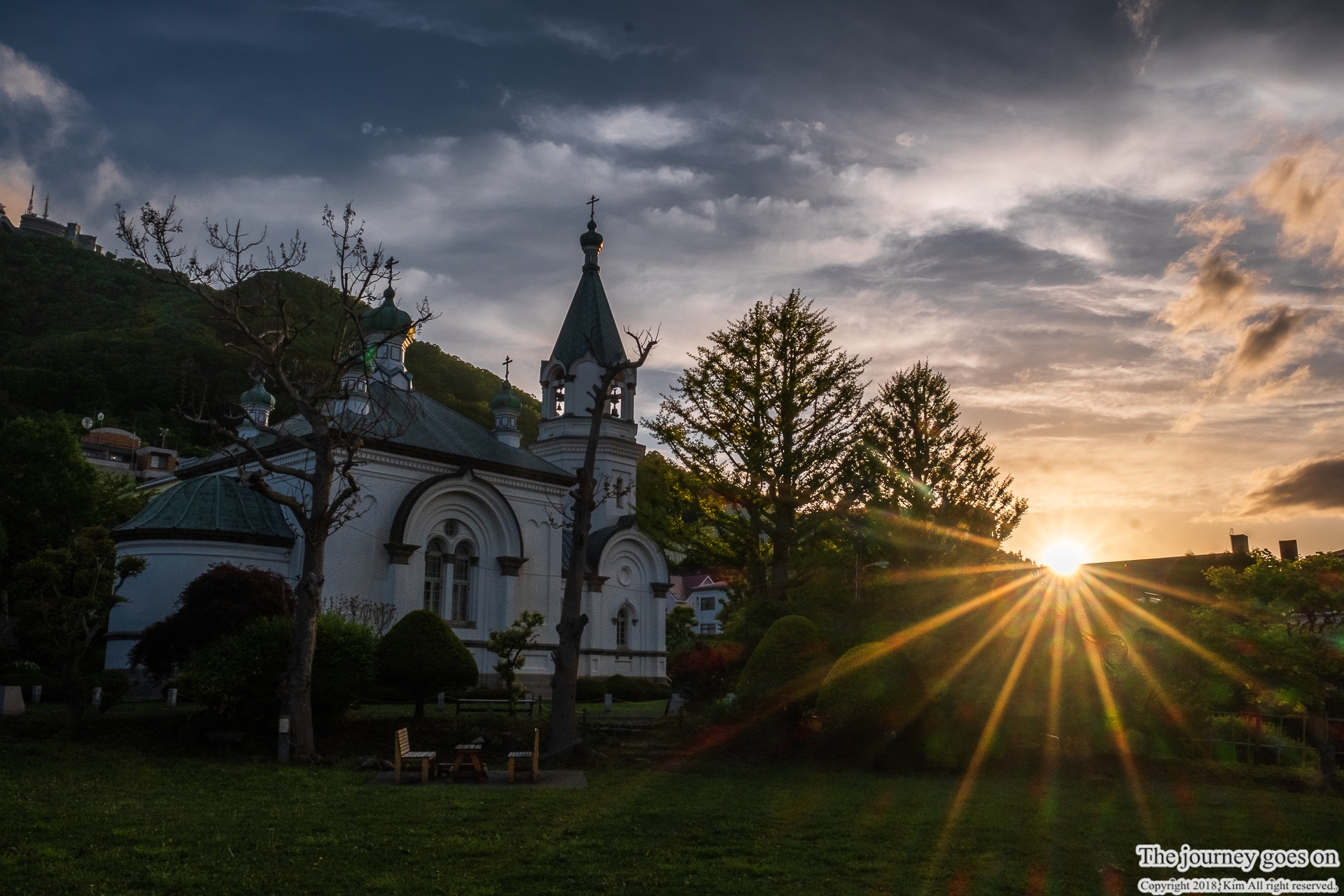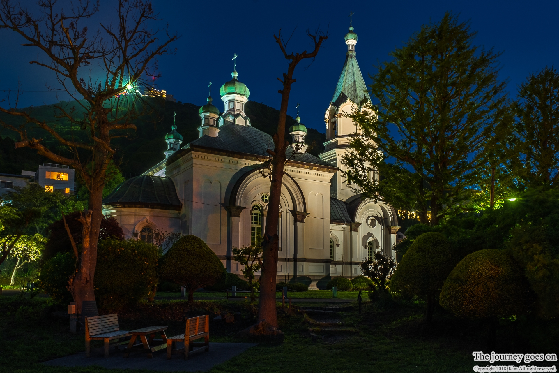 하코다테 야마 바로 앞에 자리잡고 있는 하리스토스 정교회는 러시아 정교회 풍의 건축양식으로